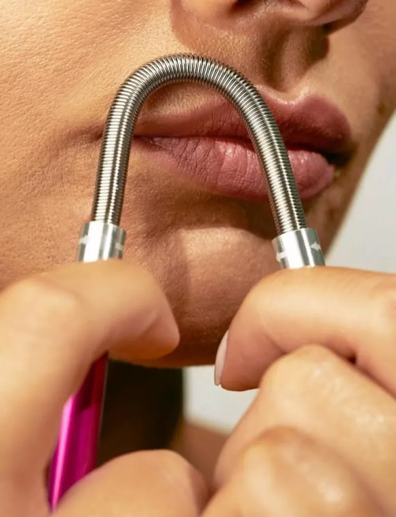 Användning1: Håll i de färgade handtagen och sätt spiralfjäderns topp mot huden där du vill ta bort oönskat hår.2: Fjädern har en platt och en rundad sida. Använd den platta sidan om du vill ta bort hår på större partier, och använd den rundade för att ta bort hår på mindre områden.3: Medan du drar fjädern längs med huden ska du snurra på de silvriga partierna på båda handtagen, pilarna visar vilket håll du ska snurra på. Detta gör att fjädern kan greppa tag om hårstråna och dra ut dem från rötterna. 4: Upprepa på alla partier där du vill ta bort hår. Rengör verktyget när du är klar.
