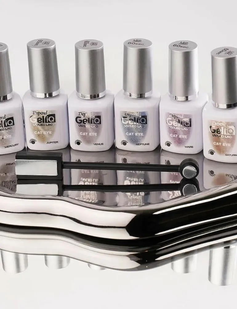 INSTRUKTIONERViktigt: Om UV-härdande produkt kommer i kontakt med huden runt nageln måste detta avlägsnas före härdningen med Gel iQ Pre-Cleanser på en tops. Instruktion för applicering av effekt Cat Eye i Gel iQ systemet.1.Rengöring: Applicera Gel iQ Pre-Cleanser på en bomullspad och rengör naglarna noggrant. Låt nageln torka 30 sekunder så att den är helt torr. Rör ej vid nagelytan efter att den är rengjord.2.¤ Baslack: Applicera ett tunt lager Gel iQ Base Coat. Härda i 30 sekunder i UV/LED-lampan.3.¤ Cat Eye: Applicera först ett tunt lager av Cat Eye och härda 60 sekunder i UV/LED-lampan (tryck först 1 gång på 30 sek-knappen och när lampan slocknar tryck 1 gång till på 30 sek-knappen). Applicera sen ett lager till av Cat Eye utan att härda OBS: Endast ett finger kan göras åt gången. Använd ditt val av magnet för att skapa Cat Eye-effekten. Håll magneten så nära nageln som möjligt utan att vidröra lacket. När du känner dig klar, härda i 60 sekunder i LED-lampa (tryck först 1 gång på 30 sek-knappen och när lampan slocknar tryck 1 gång till på 30 sek-knappen) innan man gör nästa finger. Om man inte är nöjd med mönstret kan man stryka ut lacket igen med avstruken pensel och göra om mönstret med magneten. OBS detta måste då göras innan man härdar i UV/LED lampan. Om du får lack på magneten gör du rent den med lite Pre Cleanser4.¤ Topplack. Applicera ett tunt lager av Gel iQ Top Coat och härda i 30 sekunder i UV/LED-lampan. 5.Rengöring/Top Finishing: Den klibbiga yta som bildas på nageln efter härdning av Top Coat måste avlägsnas för att skapa den optimala glansen. Då är det viktigt att man rengör hela nagelytan med Gel iQ High Shine Cleanser. Torka av ytan med ett bestämt drag för att ta bort den klibbiga ytan. Du behöver ha minst 12 bomullspads till hands.Gör så här för varje nagel:1. Applicera rikligt med Gel iQ High Shine Cleanser på en bomullspad.2. Lägg den blöta ytan på paden över hela nageln och vänta 5 sekunder.3. Tryck med 2 fingrar på paden så du får ett jämt tryck över hela nagelns yta. Dra sedan från nagelbandet och uppåt nagelns topp i ett bestämt drag.4. Byt till en ny ren pad för varje nagel och upprepa sen samma steg för alla naglarna.5. När alla naglarna är rengjorda efter denna princip gör du en rengöring till med cleansern. Detta kommer att framhäva en fantastisk glans och lyster på färgen. Blöt paden med cleanser och rengör från nagelbandet och ut mot nageltoppen. Först mitt på och sedan vänster och höger sida. Använd en ny ren pad för varje hand.6. Viktigt! Avsluta hela behandlingen med att tvätta händerna noggrant med tvål och vatten.Du är nu färdig med behandlingen och har en högglansig hållbar lackning som varar ca 2 veckor.Så här tar du bort Depend Gel iQBeroende på vilken nageltyp och nagelkvalité du har kan man uppleva det olika svårt att få bort lacket. Därför har vi valt att använda oss av 2 olika metoder för detta. Vi rekommenderar i första hand metod 1 för att ta bort lacket. Denna metod fungerar för merparten av alla nageltyper. För de övriga rekommenderar vi metod 2.Metod 1: Gel iQ Remover Oil tar på ett skonsamt sätt bort Gel iQ med en vegetabilisk olja. För att denna metod ska fungera krävs en viss utväxt mellan nagelbandet och lacket, vilket man naturligt har fått efter att lacket har suttit i 2 veckor. Metoden är mycket skonsam mot nagel och nagelband och fungerar genom den speciella kemi som denna produkt är utvecklad efter genom att man får en reaktion mellan Removeroljan, vattnet och lacket. Metod 2: En mer traditionell borttagning. Här använder man Gel iQ Remover och Gel iQ Removal Wraps Foil som hjälpmedel för att förenkla borttagningen. Borttagning med Metod 1Produkter som ska användas:Gel iQ Remover OilLjummet vatten ca 40 grader En skål, ca 2 liter, som gott och väl rymmer en hands fingrar. Eller använd handfatet.Så här gör du1. Applicera rikligt med removerolja på ena handens fingrar längs nagelbandet och över hela nageln.2. Massera ca 20-30 sekunder på varje nagel.3. Tappa upp vatten i skålen eller handfatet. Temperaturen ska vara ca 40 grader. OBS: Får ej brännas.4. Sänk ner fingrarna i det varma vattnet (ca 40 grader) så att handens alla fingrar är täckta med vatten och vänta 3 min. Ju varmare vatten desto bättre effekt.5. Efter ca 3 min, börja försiktigt skrapa bort lacket vid utväxten närmast nagelbandet med din egen nagel eller en manikyrpinne med handen fortfarande kvar i vattnet. Skrapa lite och låt vattnet komma till skarven mellan nageln och lacket. På så sätt löses Gel iQ successivt upp och du får med dig lacket som en flaga om du gör på rätt sätt vid borttagningen. Det är reaktionen mellan oljan, lackformulan och vattnet som gör denna unika borttagning möjlig. Viktigt – tänk också på att vattnet svalnar, och för bästa effekt ska temperaturen ligga på ca 40 grader. Det kan därför vara bra att byta eller värma på vattnet under själva borttagningen.OBS! Var försiktig och lös upp bit för bit av lacket med fingrarna kvar i vattnet. Var extra försiktig när du skrapar så du inte får med något av din egen nagel, speciellt längst ut på nageln där den är som torrast och lätt kan gå av. Lacket sitter oftast som hårdast längst ut på nageln.6. Om du fortfarande inte fått bort lacket från nageln, upprepa med mer olja och varmt vatten enligt instruktion ovan tills lacket släpper helt.Upprepa samma procedur för andra handen. Avsluta med att massera in överflödig olja och torka händerna torra. Borttagning med Metod 2Produkter som ska användas:Gel iQ Remover Gel iQ Removal Wraps FoilSå här gör duSkydda underlaget med en handduk där du sitter och gör borttagningen. Sörj för god ventilation under hela behandlingen. Gör bara en hand åt gången eftersom det är svårt att jobba med remover folie på händerna. Viktigt är att ma