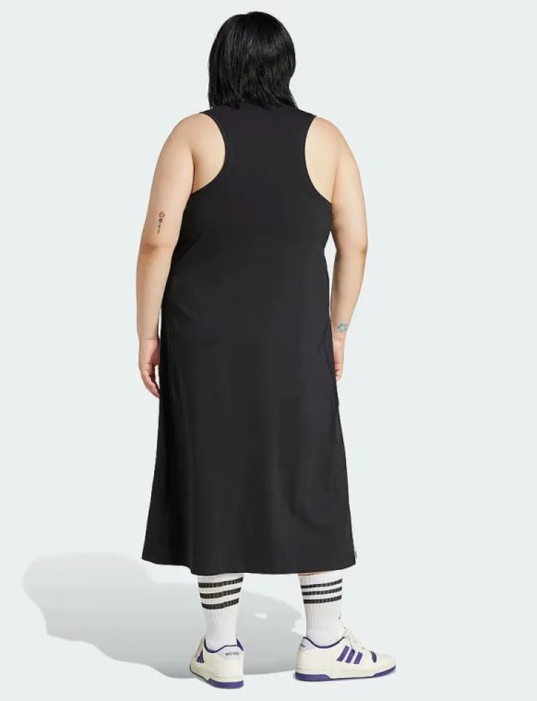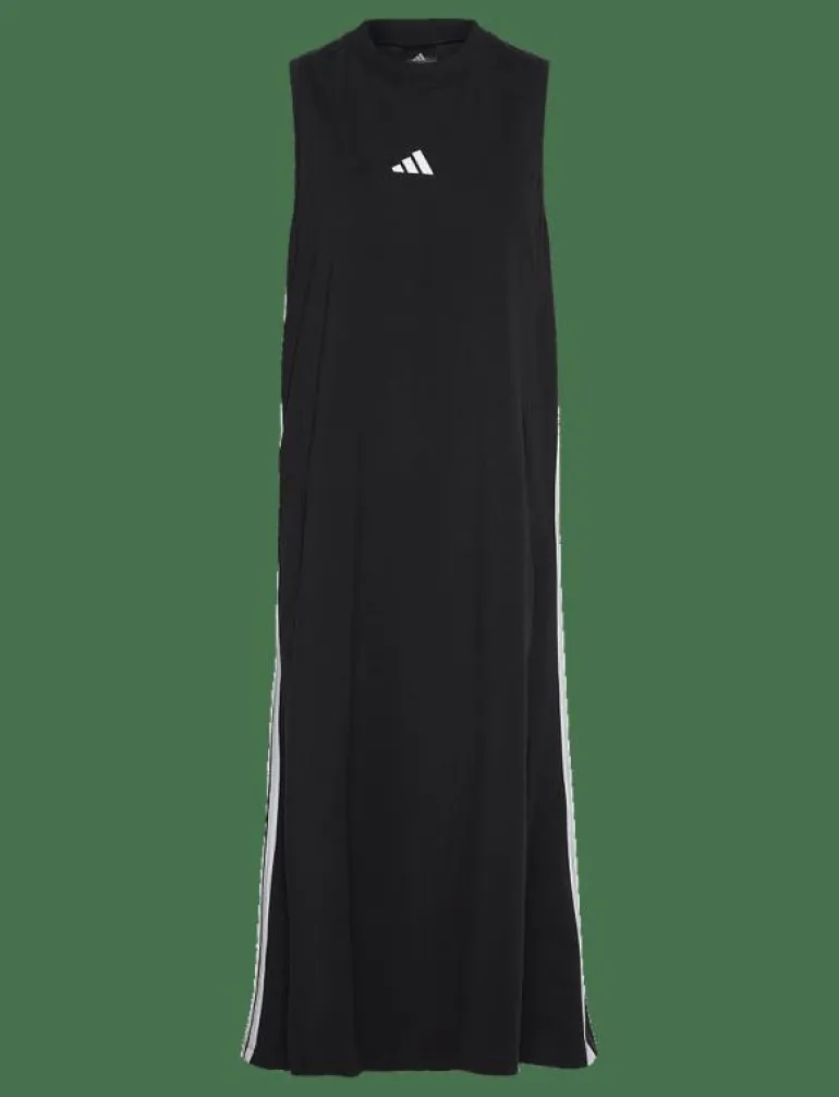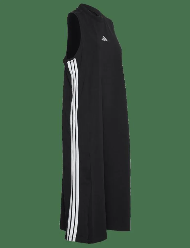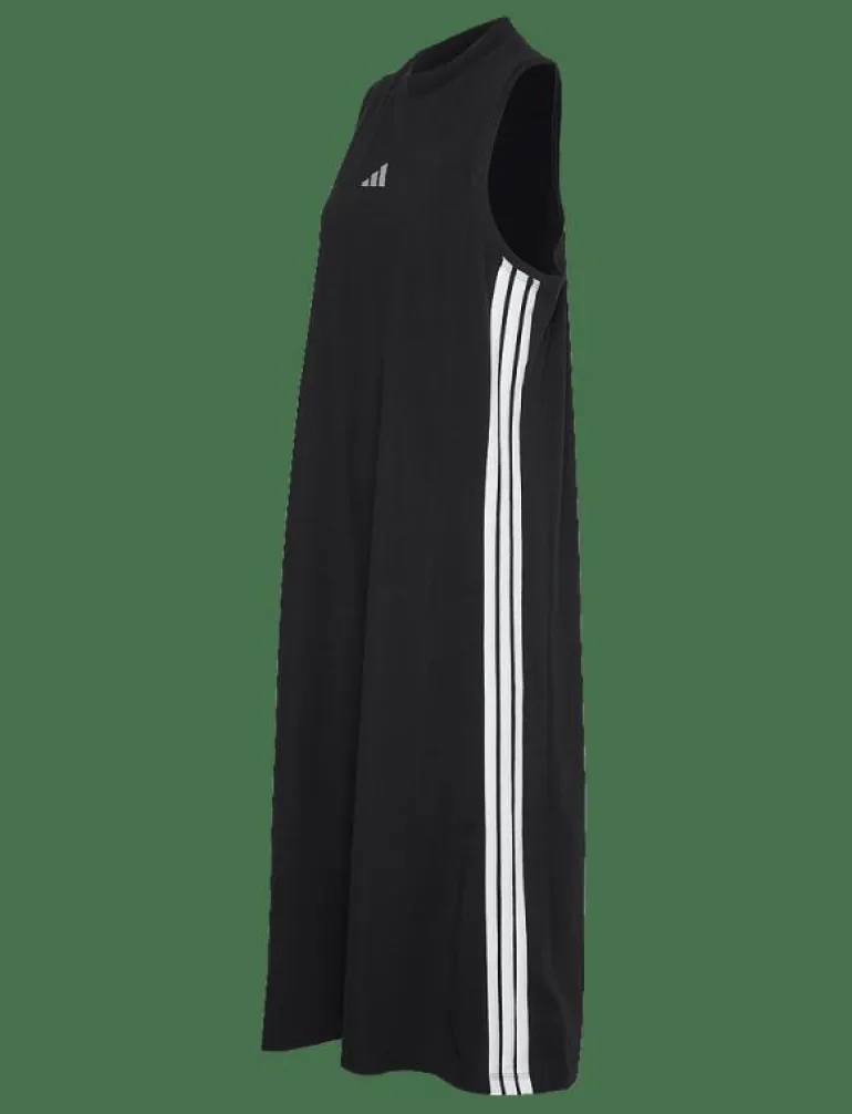 Den här klänningen är perfekt för kvinnor som vill ha ett snyggt och bekvämt alternativ för sina träningspass eller vardagskläder. Den är gjord av mjukt och andningsbart tyg, vilket gör den perfekt för att hålla dig sval och bekväm under dina träningspass. Klänningen har också en liten adidas-logotyp på bröstet och tre ränder på sidorna, vilket ger en touch av sportig stil.